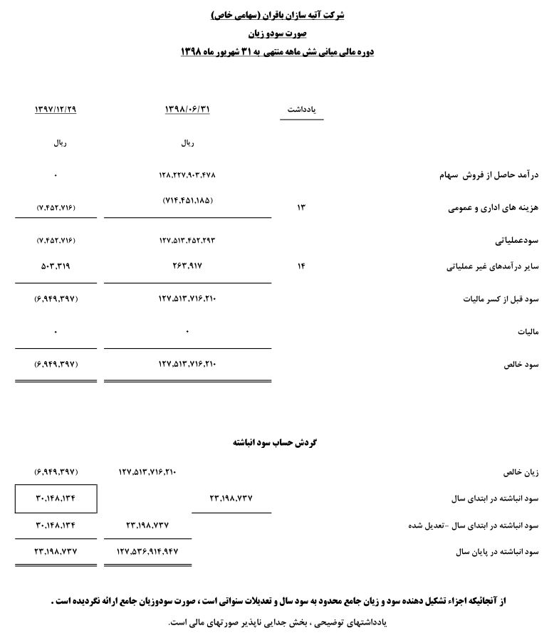 همچنین مبلغ ۱۱ میلیارد تومان سود شرکت فرعی (آتیه سازان) در دوره 6 ماهه منتهی به 31 شهریور 98 تحقق یافته است.